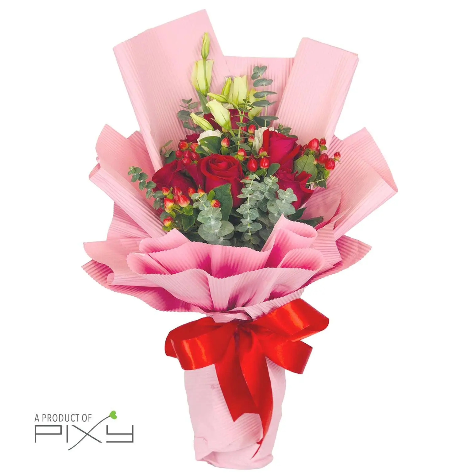 This hand bouquet features 6 stalks of Premium Ecuadorian red rose, hypericum red, eustoma and eucalyptus cinerarea.