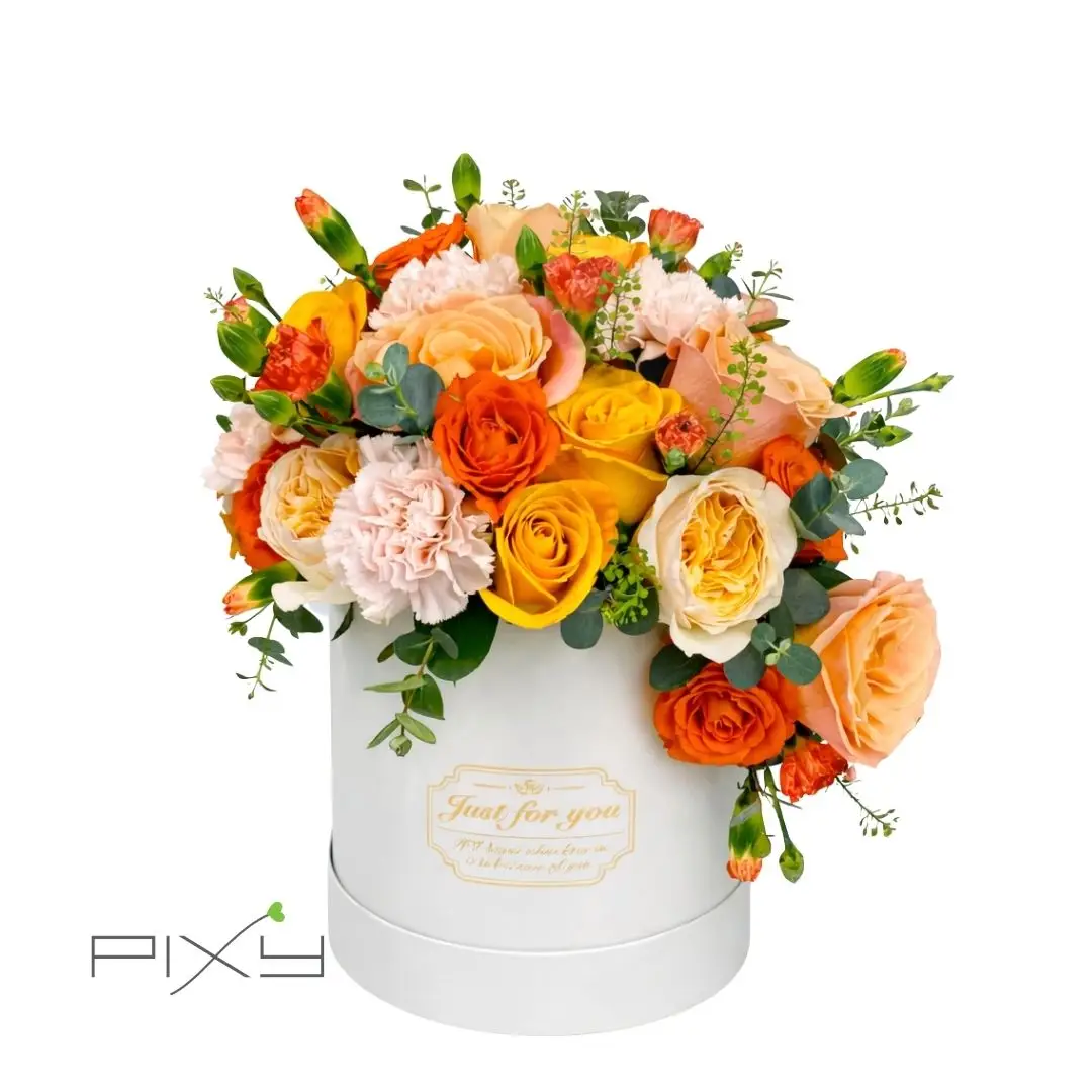 Express joyful admiration with this brilliantly warm presentation. A vibrant cascade of amber, golden, and soft peach blossoms spills elegantly from a pristine white cylinder. Accented perfectly with fresh, silvery foliage, this radiant gift beautifully honors her glowing energy and endless warmth.