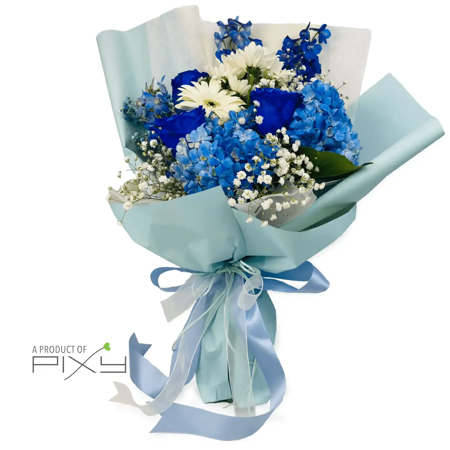 Experience the tranquility of a serene blue bouquet featuring rare blue roses, delicate hydrangeas, tall delphiniums, and charming daisies, all complemented by the subtle beauty of baby’s breath. Elevate any occasion with the soothing ambiance of this exquisite arrangement.