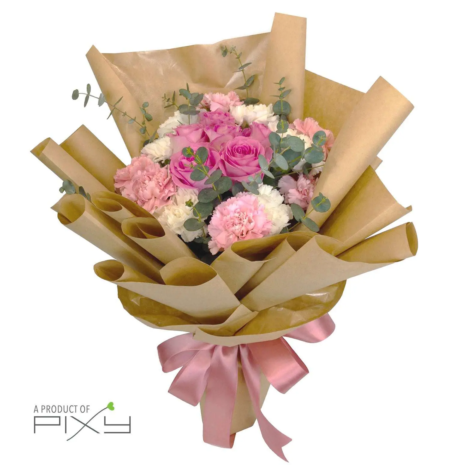 This hand bouquet features 6 stalk of premium Ecuadorian pink roses, 6 pink and 6 white carnation with eucalyptus gunnii.
