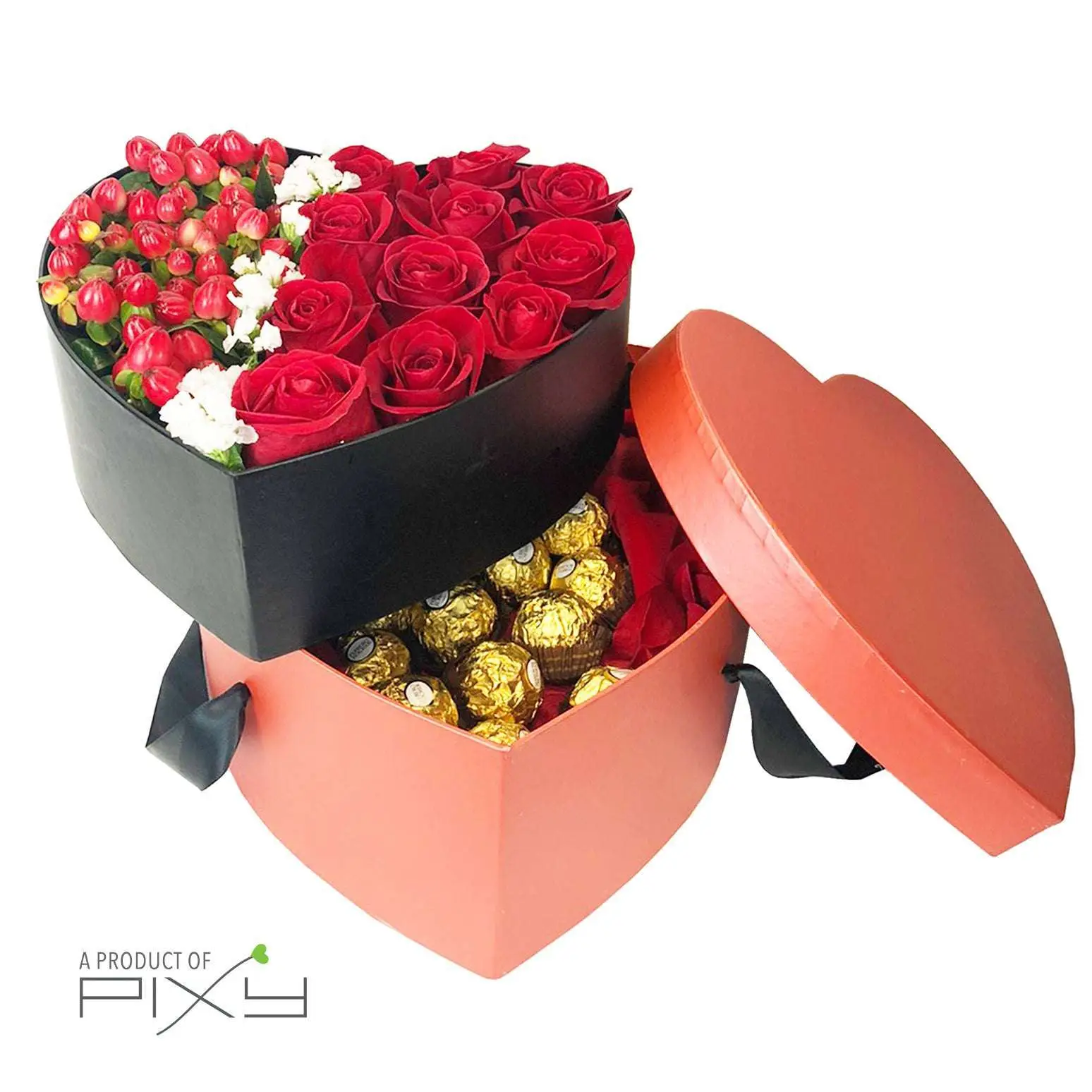 A treasure trove of timeless romance, passion and a little bit of magic; presented elegantly in a box of fresh roses supplemented with red hypericum and ferrero chocolates‚ for that burning love of your life.