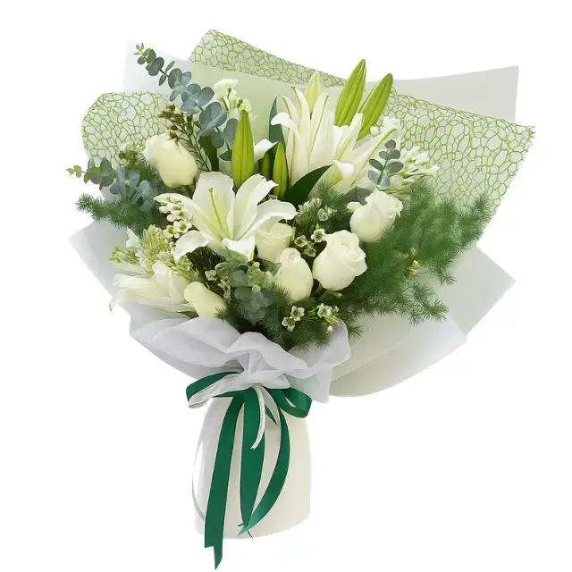 A tranquil arrangement of white lilies and roses accented with greenery and soft textures, created for thoughtful and composed occasions.