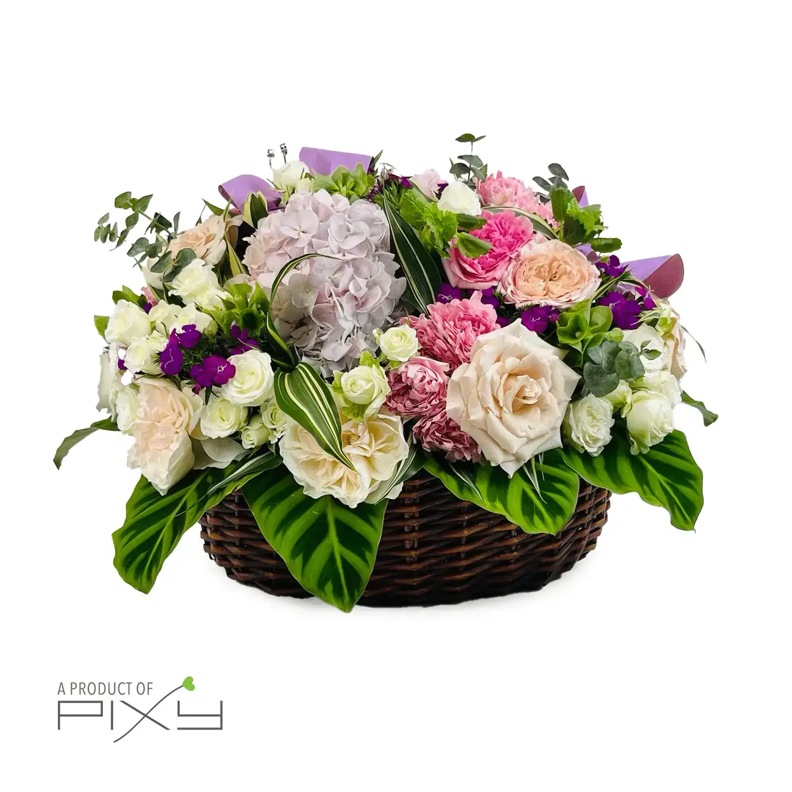 Introducing our exquisite “Pastel Garden Delight” basket arrangement, a captivating blend of delicate garden roses in soft pastel hues. Adorned with charming pink spray roses and complemented by the gentle tones of hydrangea, this arrangement is a true vision of beauty. The addition of calathea leaves and dracaena leaves adds an elegant touch, while the subtle fragrance of eucalyptus fills the air. Perfect for any occasion or as a heartfelt gesture, this arrangement will bring joy and serenity to its recipient’s day.