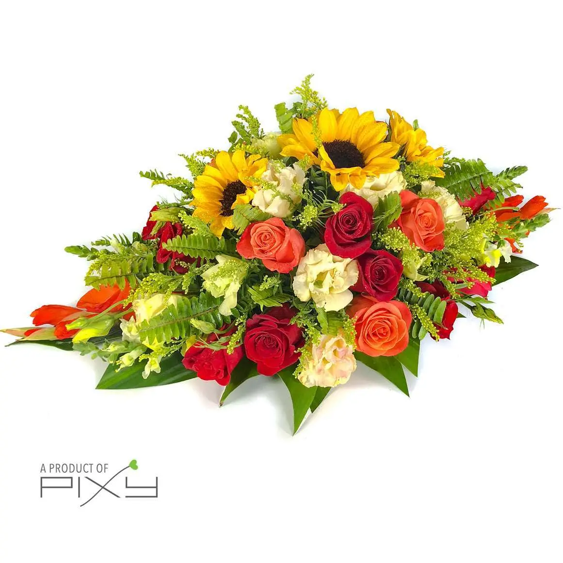 Roses and Sunflower compete in this very elegant table bouquet, elaborated in shades of green powder ready to bloom your best opportunities. A floral conception presented exclusively for its receiver, highlighted by delicate foliage and seasonal flowers. To offer without moderation!
