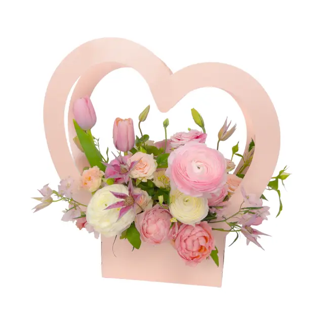 A soft heart-shaped frame holds layers of ranunculus, tulips, and garden flowers in blush and cream colors. This piece is meant to feel soft and intentional. It talks about care, closeness, and love that is shown quietly but fully.