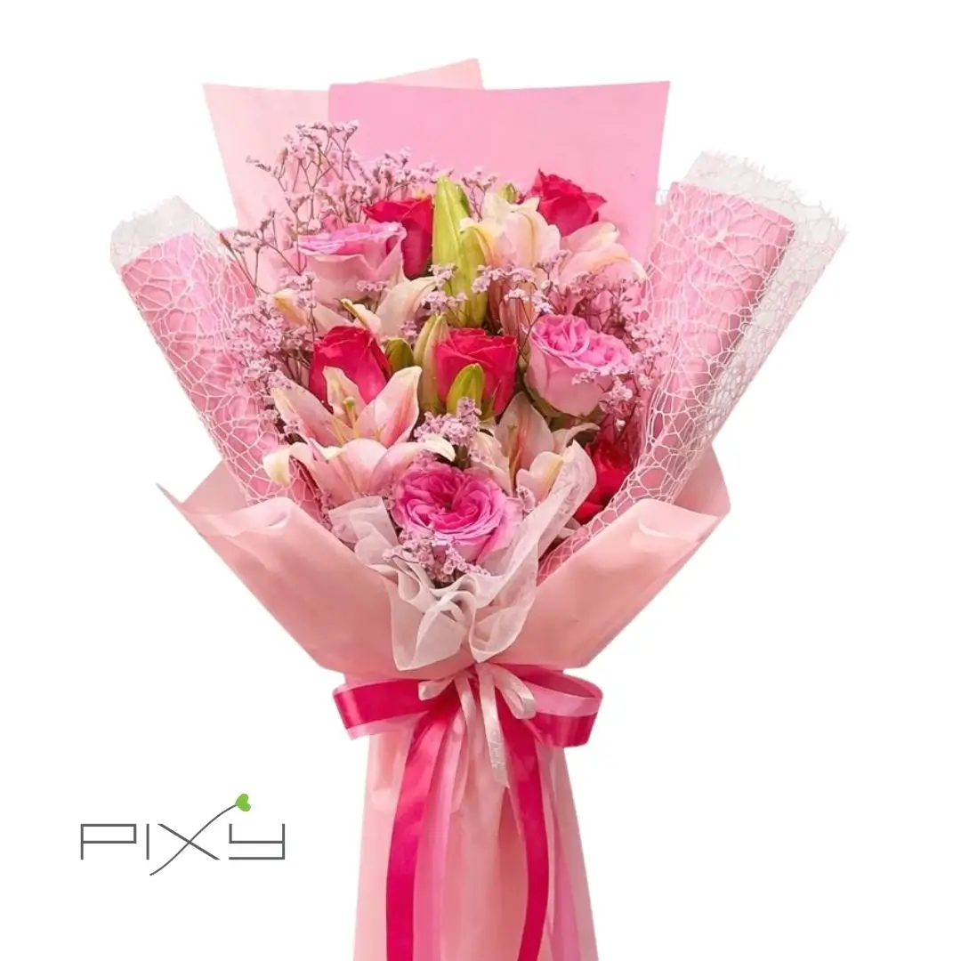 Show your heartfelt appreciation with this radiantly feminine presentation. Vibrant magenta velvet blossoms and soft blush trumpet blooms are perfectly intertwined with delicate, airy fillers. Nestled within pale pink parchment and textured mesh, then secured with a cascading dual-toned ribbon, this elegant gift beautifully celebrates her gentle yet inspiring spirit.