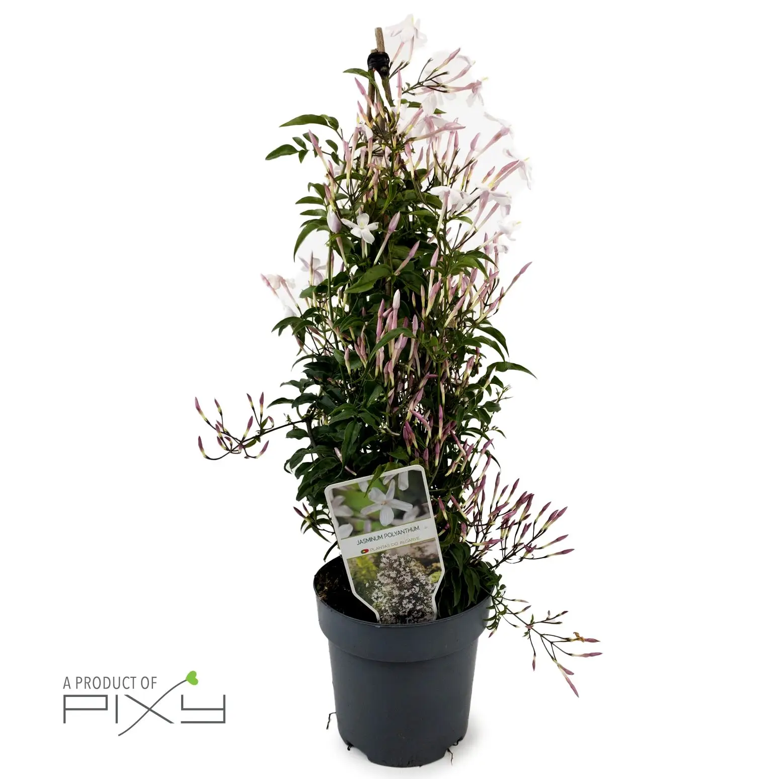 Infuse your home with the sweet fragrance and delicate flowers of the Jasminum plant. Presented in a sturdy pot, this evergreen shrub features slender, vine-like stems and star-shaped blooms that unfurl to reveal a soft pink hue. Perfect for adding a touch of elegance and a soothing aroma to any corner.