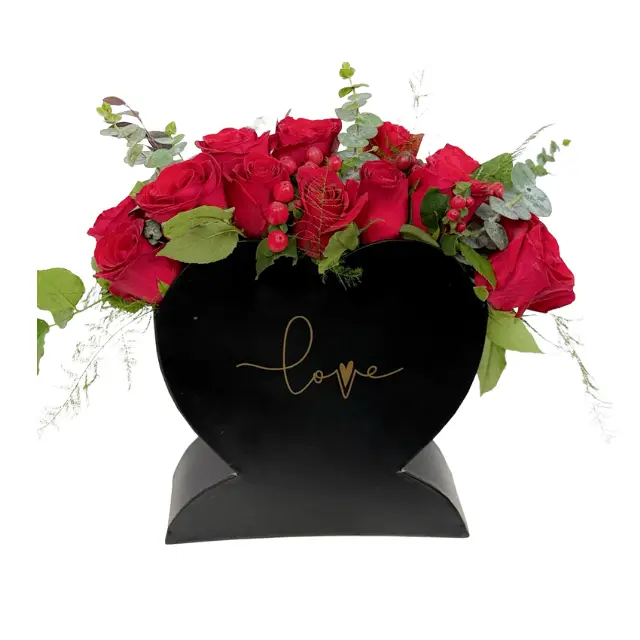 A bold heart-shaped arrangement of rich red roses nestled in a sleek black box, crafted to proclaim deep feeling without a single word.