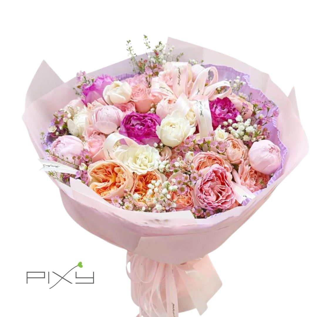 Express your admiration with this remarkably lush presentation. A breathtaking volume of soft peach, vibrant magenta, and blush layered blossoms intertwines with delicate starry fillers. Swathed in elegant pastel pink wrapping and cascading sheer ribbons, this exquisite arrangement celebrates her endless warmth and radiant grace.
