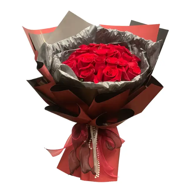 A bold arrangement of soft red roses wrapped in dark colors and silky ribbons to create a sense of closeness, confidence, and unquestionable impact.