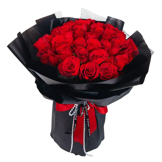 Crafted to make a strong statement or make an elegant gesture, this bouquet features superb red roses encased in stunning black layers with sophisticated accents.