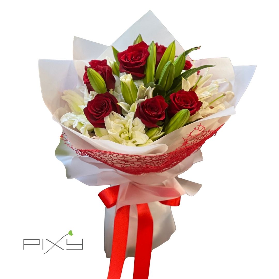 Awaken her senses with this compelling centerpiece. Rich, velvety red roses stand proudly beside elegant, pale lily buds. Tucked immaculately into clean, stark white paper and framed by an eye-catching crimson net. Finished with a matching bright ribbon, this fiery offering ensures a truly spectacular greeting.