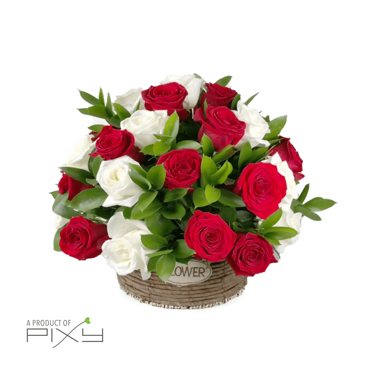 With amalgamation of red and white roses graced with leaves to add green, the color of life. To signify someone the respect and immense love you have for her/him this sophisticated present will gaurantee the voice of your message.