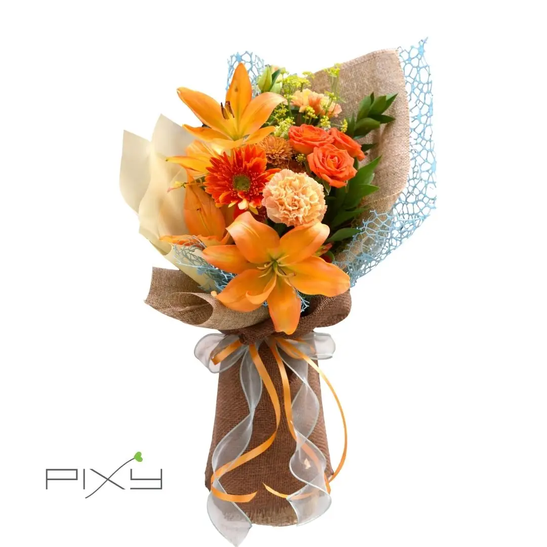 Fuel her boundless enthusiasm with this glowing arrangement. Brilliant orange lilies, vibrant gerberas, and peach carnations radiate warmth alongside fresh foliage. Artfully bundled in rustic burlap and contrasting sky-blue netting, it is tied with a sheer, citrus-edged ribbon. This striking, energetic presentation guarantees to uplift and inspire.
