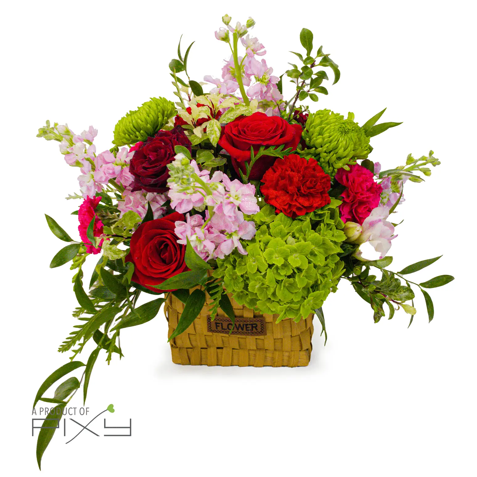 a charming mix of red roses, carnations, and stocks that captures the playful and carefree spirit of a garden. With its fresh and fragrant blooms, this arrangement is perfect for bringing a touch of nature’s magic to any space.