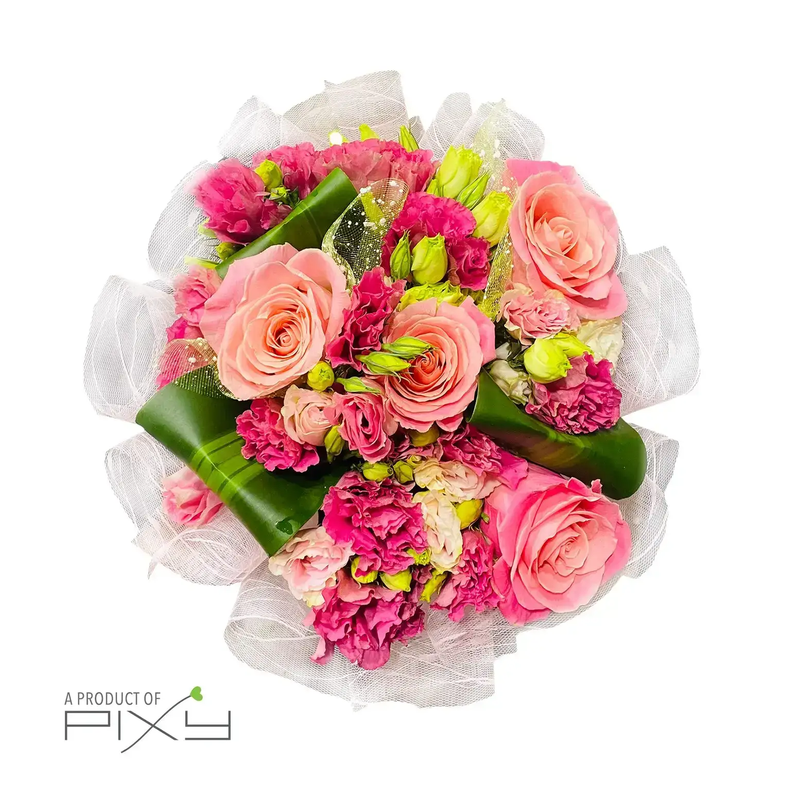 Indulge in the ethereal beauty that nature has to offer with our Whispering Petals bouquet. This serene arrangement features a delicate blend of peach and pink roses, gracefully accompanied by charming pink eustoma.